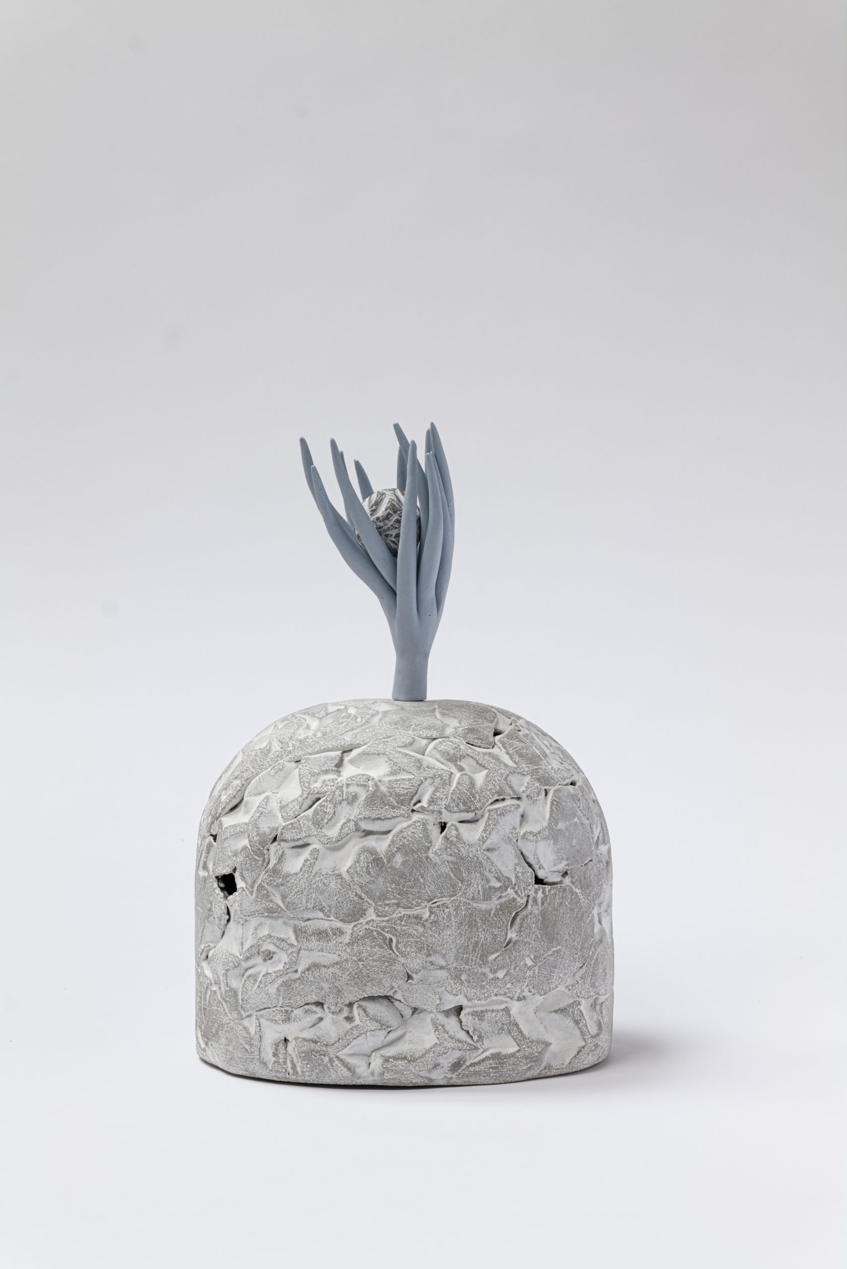 Grey stoneware, anthracite stoneware, terracotta crank and plant fragment cast in porcelain paperclay