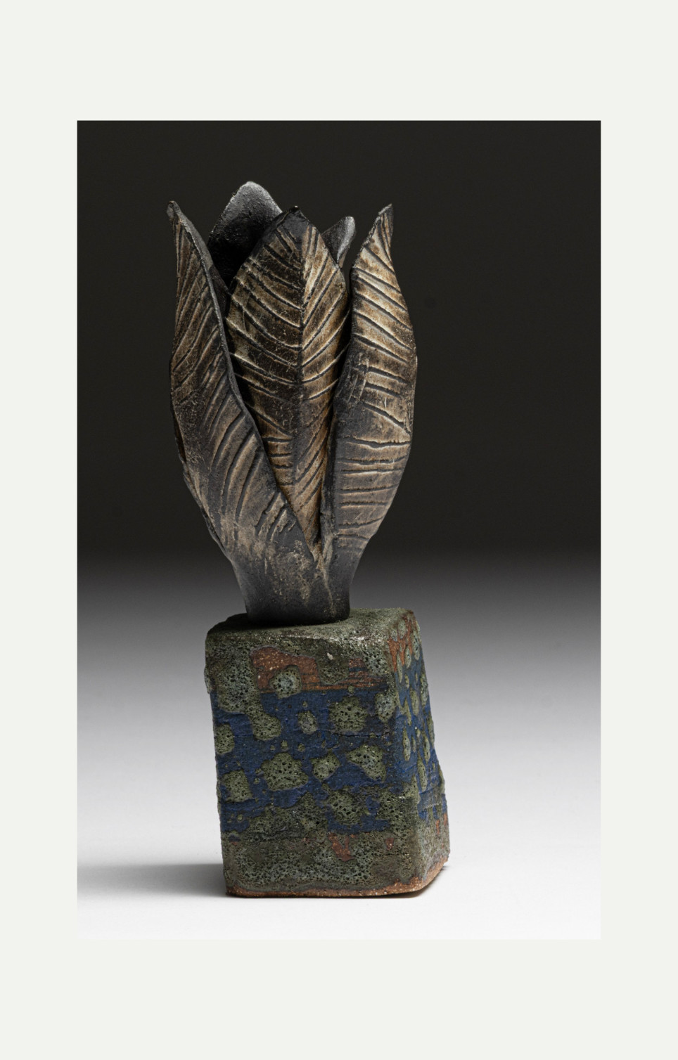 Hand built in chocolate black and crank clay with embossed decoration, underglaze colour and printed textured glaze.