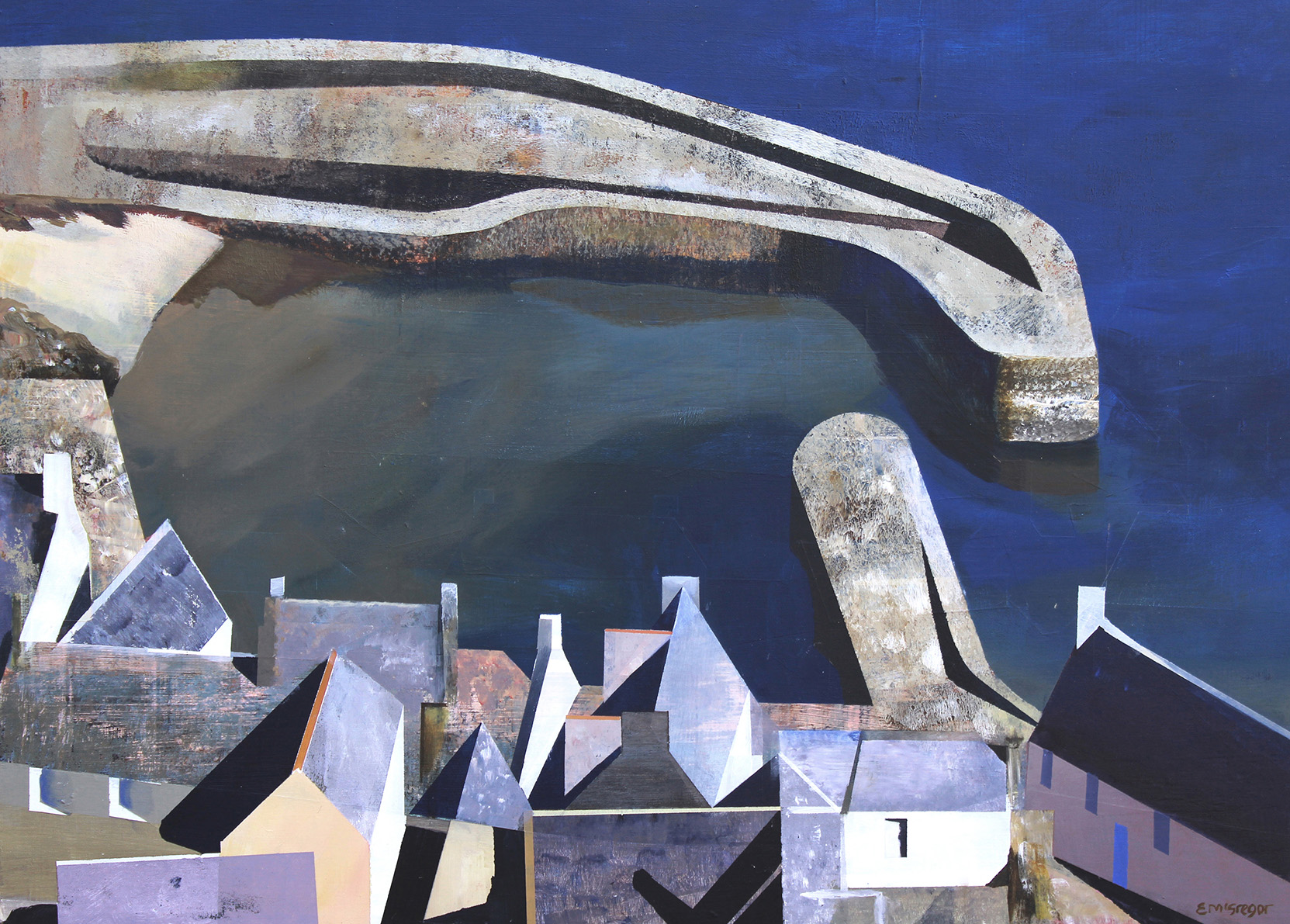 Ominous, erratic seascapes met with unwavering solidity and safety is a dream juxtaposition for an artist like McGregor. Using highly contrasted lighting he emphasises the features and facets of the environment and draws us into the comforting sight of a lighthouse and the relief of entering a safe harbour. This sentiment is so resonant with our lives today as some of us enjoy the return of some of our cherished routines and pleasures while others are setting out into the unknown.