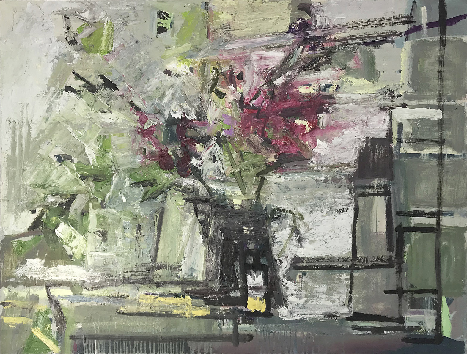 Drawing and painting from her immediate environment Virginia Bounds is witness to the intangibles of shadow of light. Through the artist’s immersion in the process of looking and responding, mixing and arranging material onto a surface she constructs and deconstructs with colour and shape until the manifestation of something new and unimagined arises. There are no fixed point for the eye to rest/be still in her works but movement and rhythm, in an ambiguous space that remind an audience that the works are observed from a life constantly in motion.