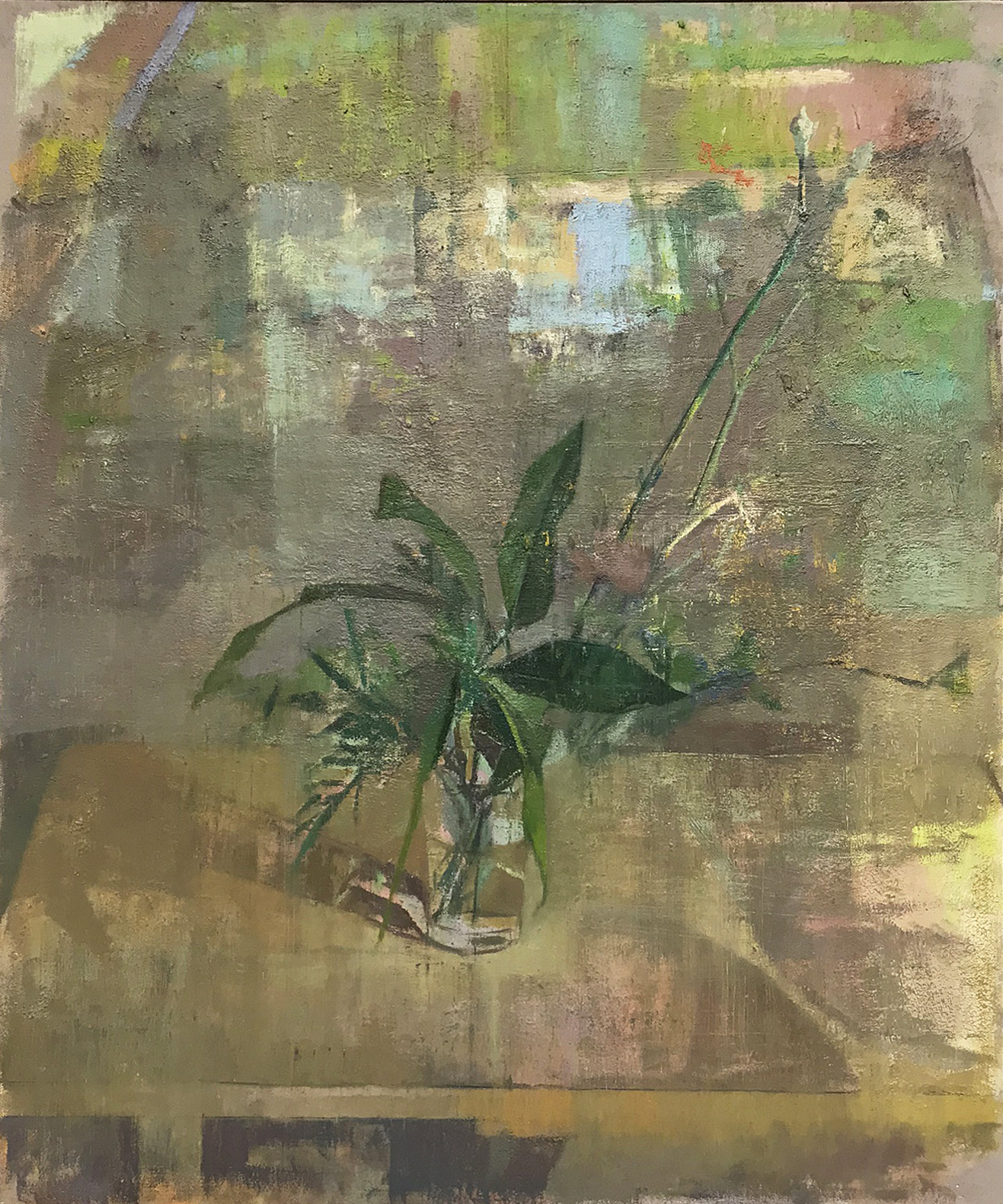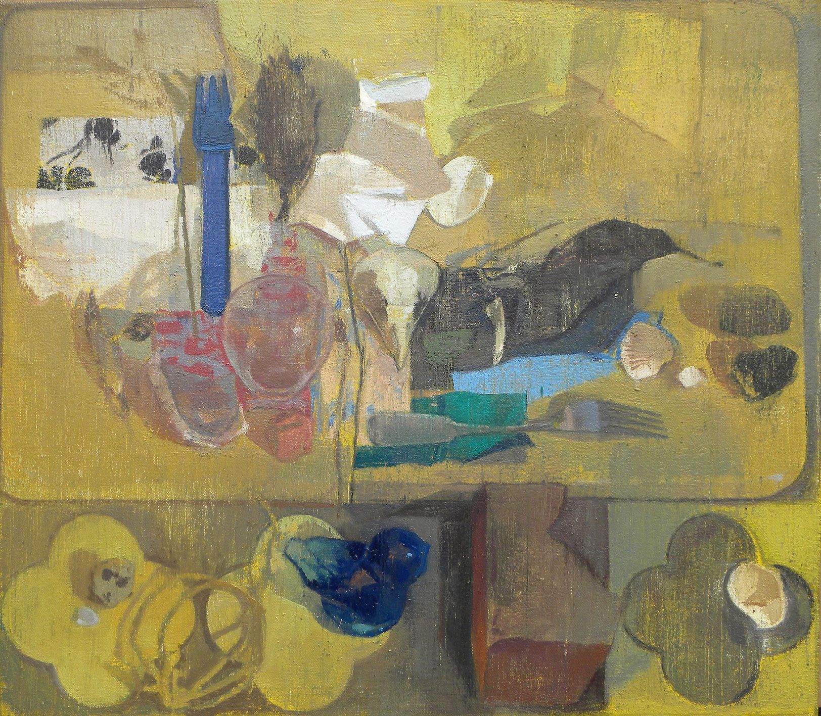 I imagine these stories overlapping across time and space, converging in unassuming vignettes arranged in the studio. Certain elements reappear from painting to painting like characters weaving in and out of a serial narrative. Figures make themselves know occasionally, but often the human element is only alluded to by the signs of daily activity; a cup and saucer, a meticulously placed collared shirt, heirloom bowls, seashells from a favorite family trip and various bric-a-brac all overtly staged by the human hand. The stories the objects in these stagings tell are opaque.