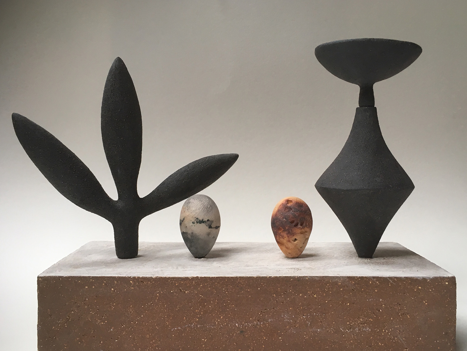 Grey stoneware, anthracite stoneware, terracotta crank and plant fragment cast in porcelain paperclay