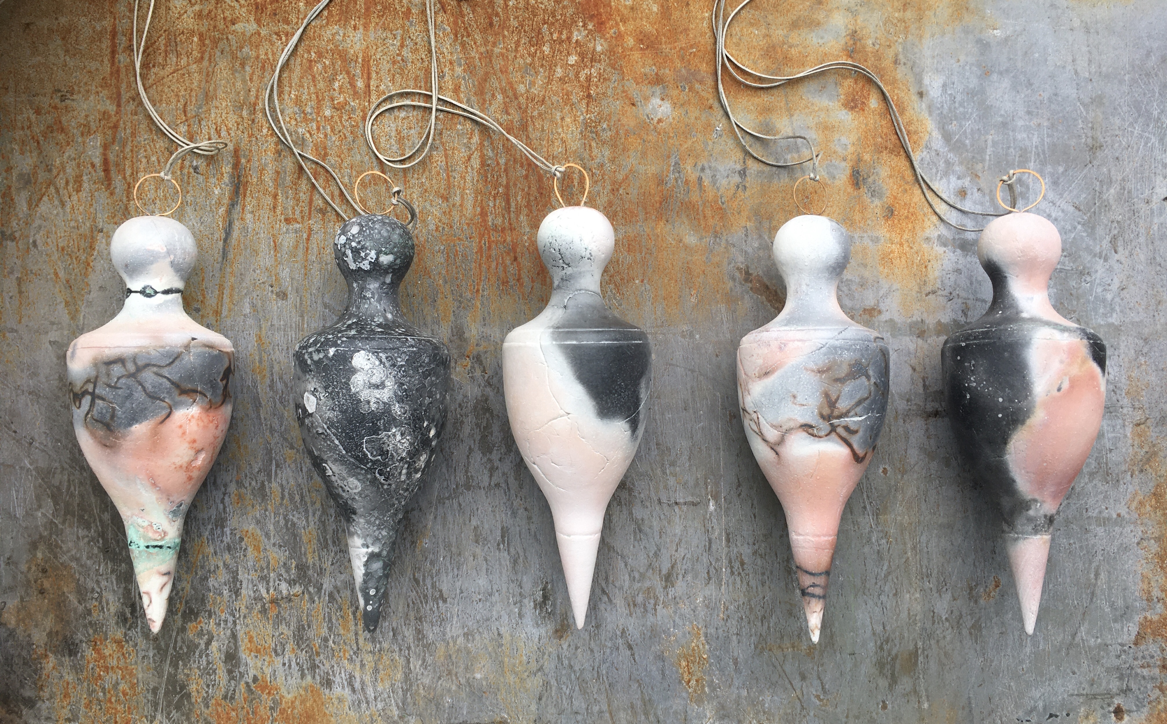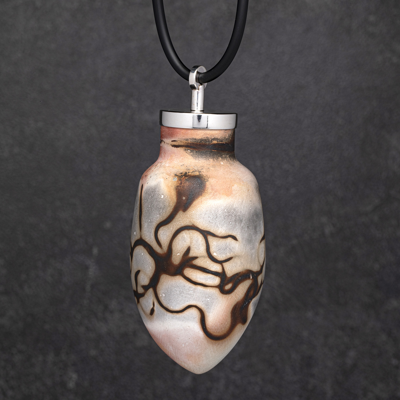Saggar fired porcelain, sterling silver and rubber cord.