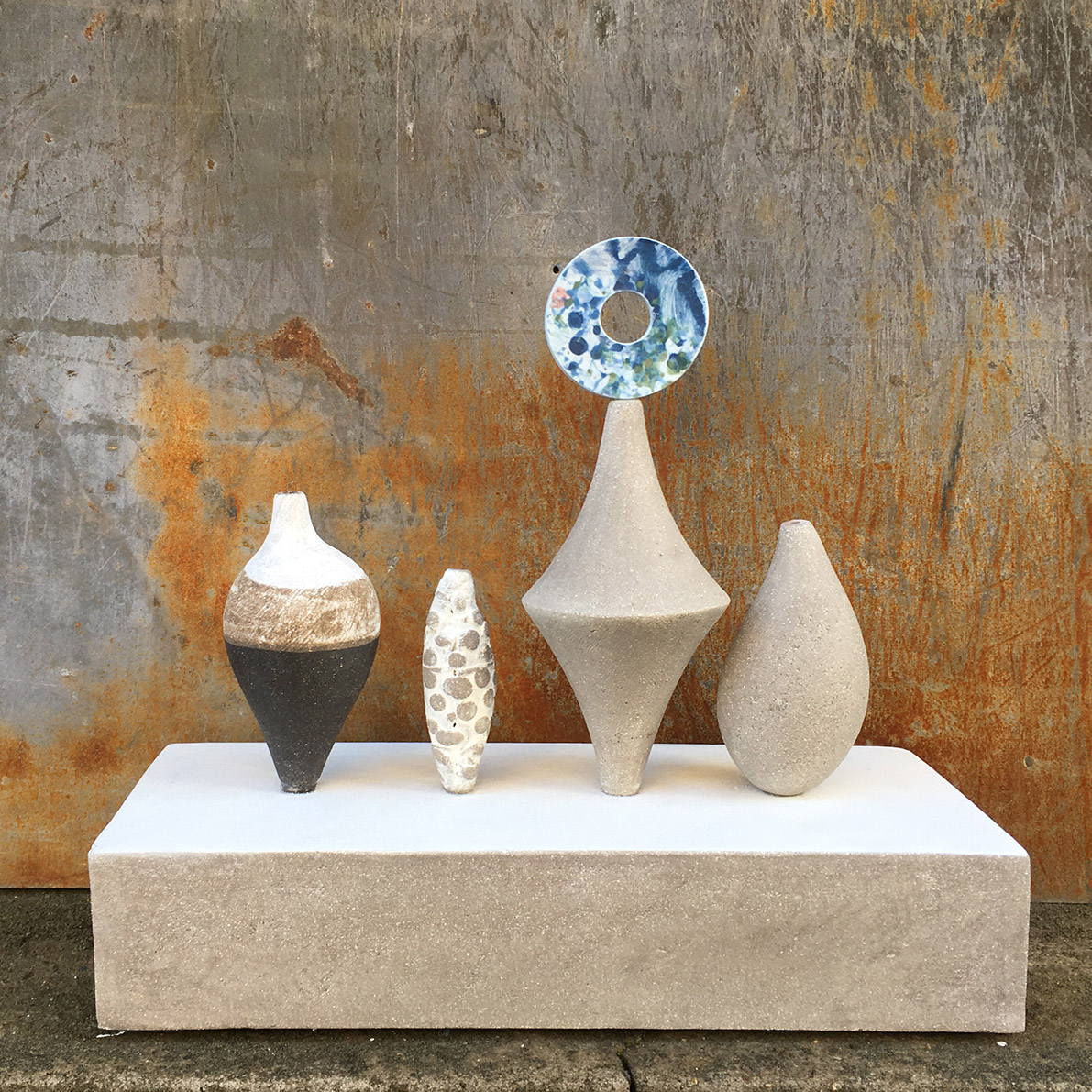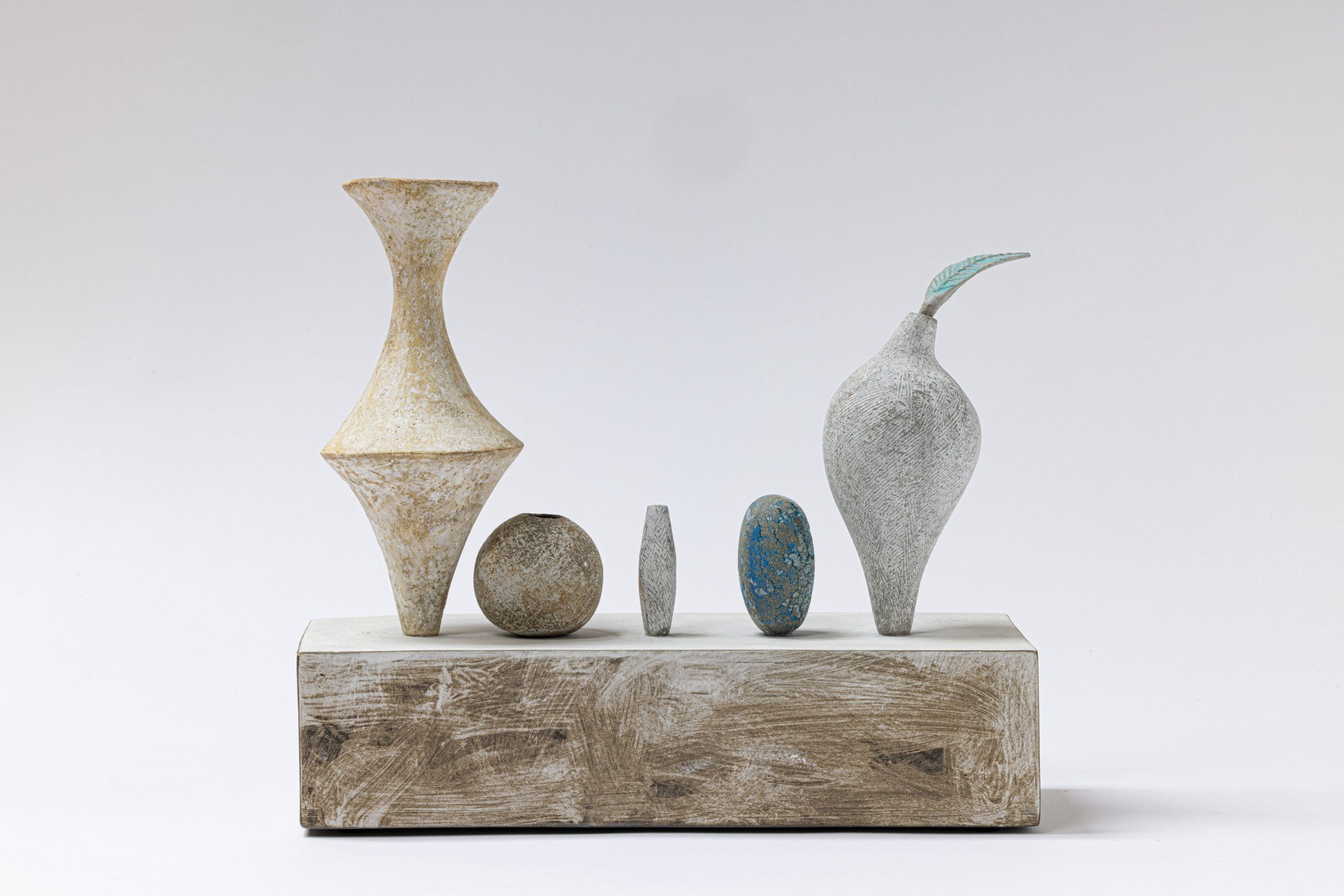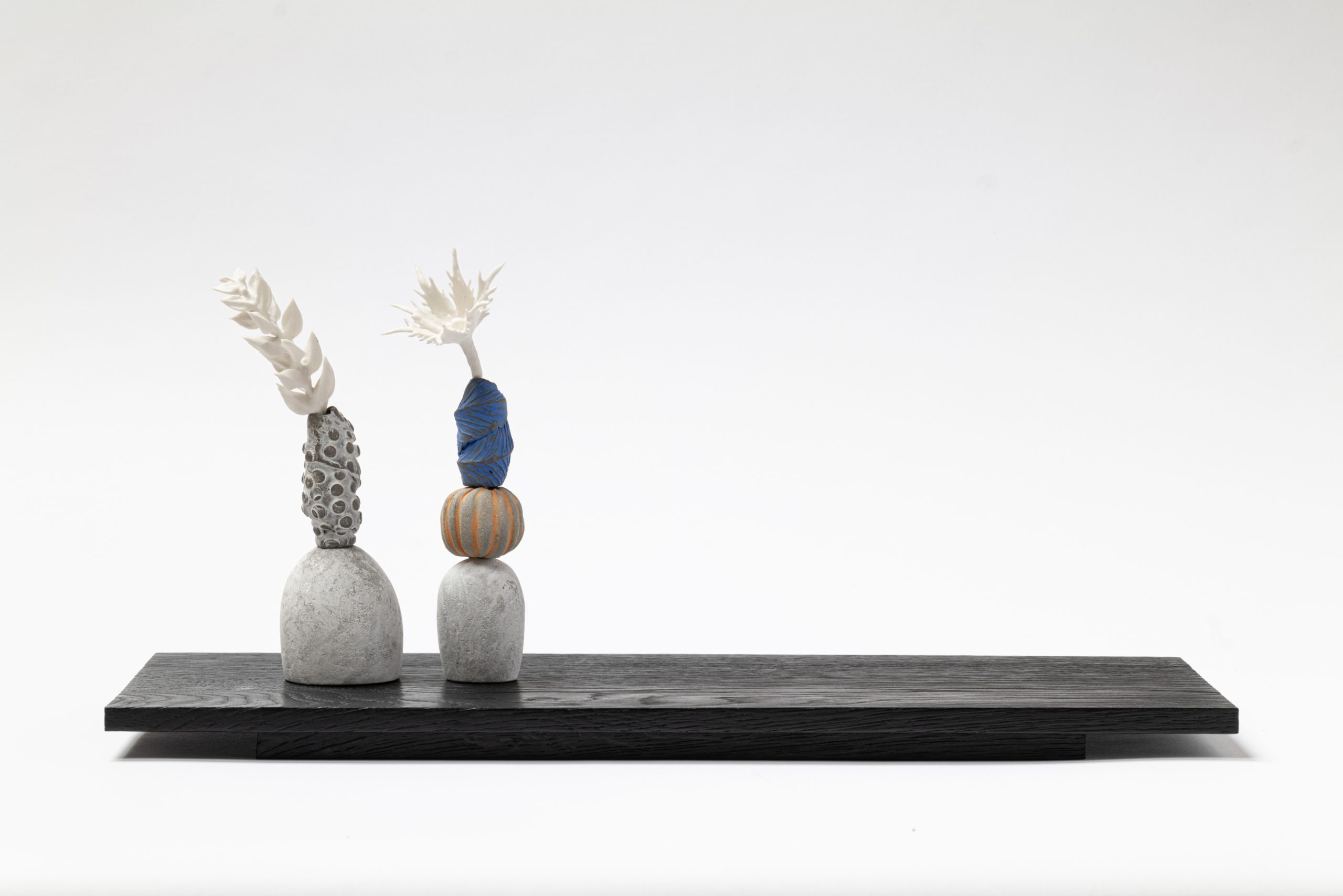 Grey stoneware, black earthenware, porcelain paperclay and underglaze colour.
