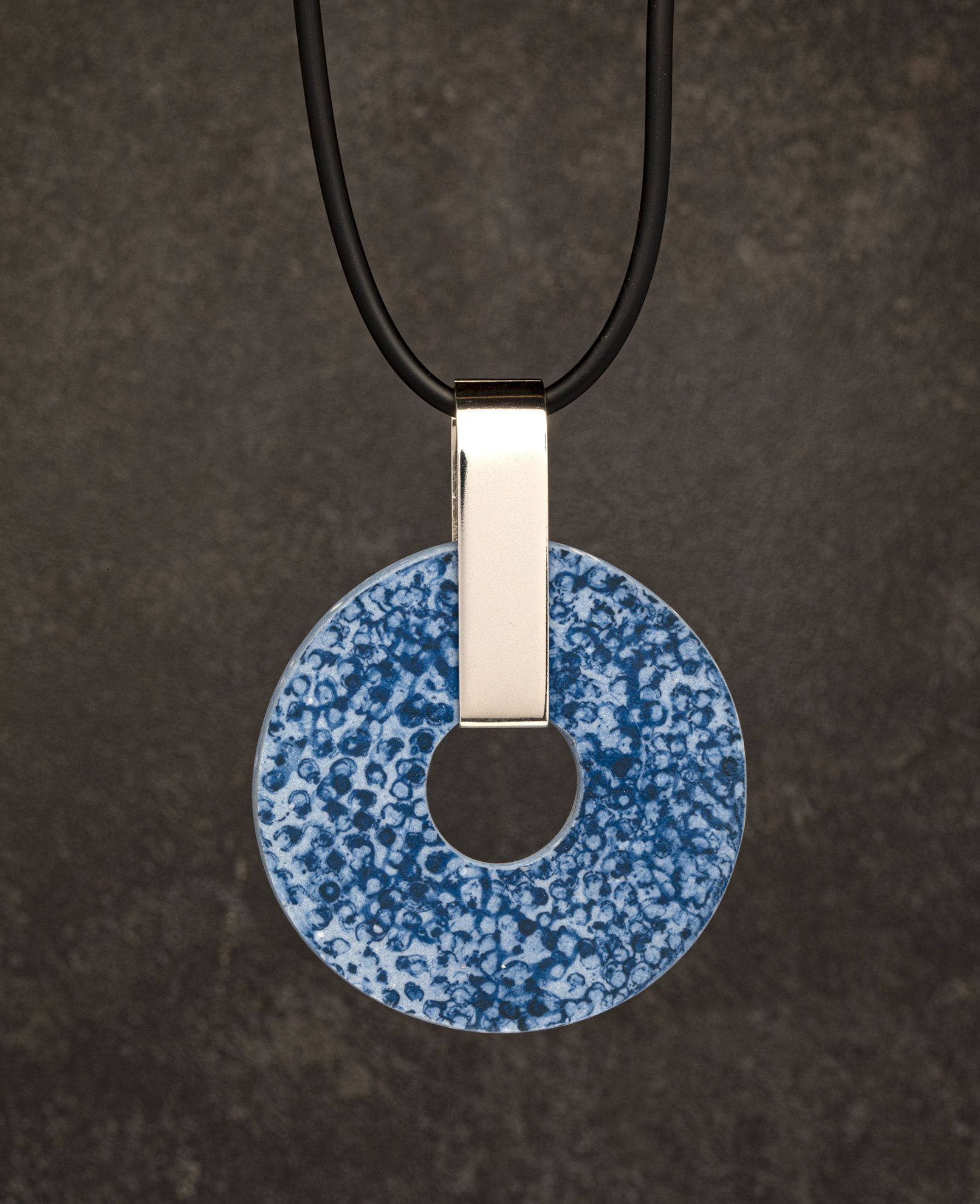 Printed and coloured porcelain, sterling silver and rubber cord.