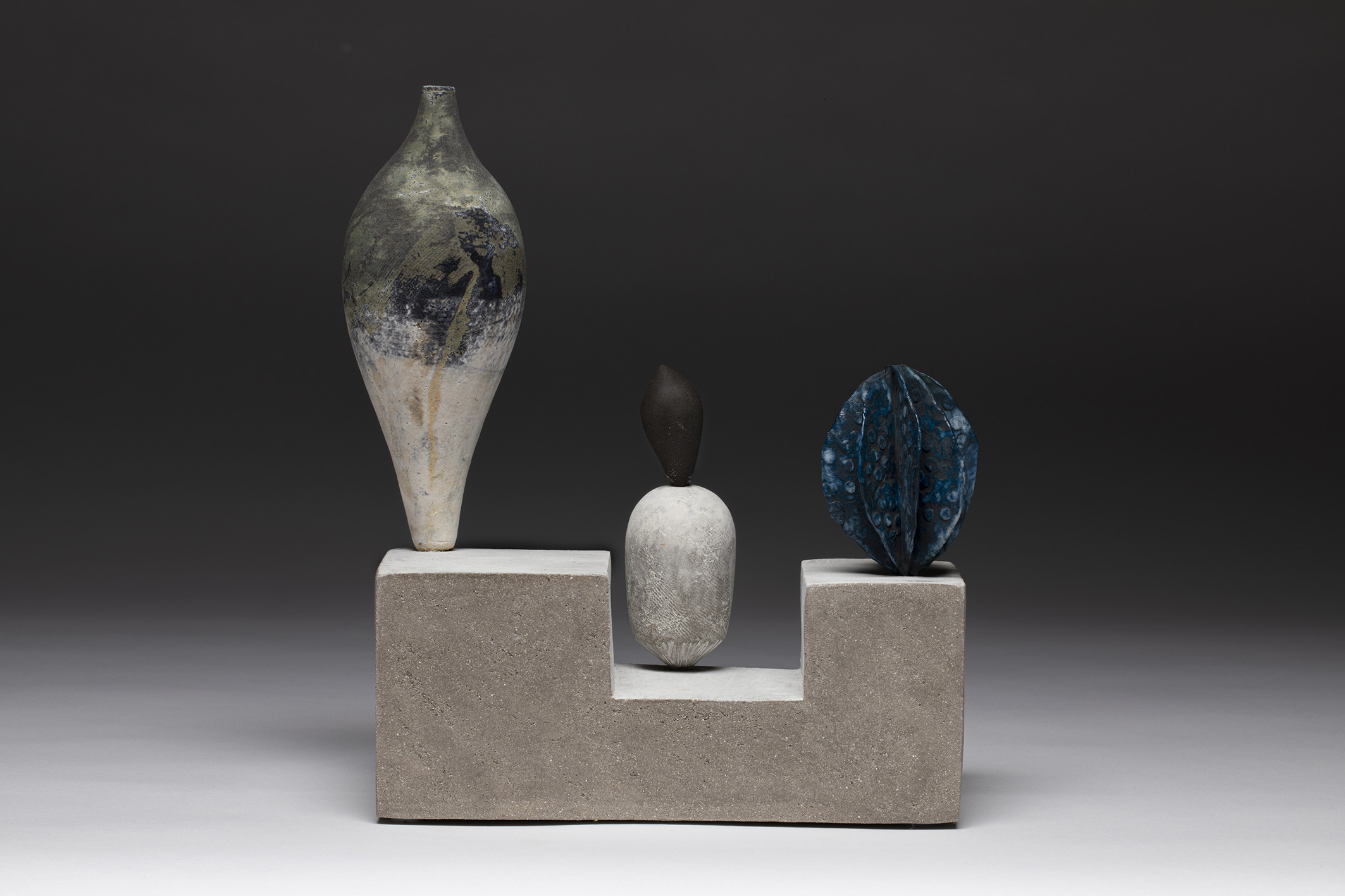 Grey stoneware, black stoneware, porcelain, underglaze colour and textured glaze
