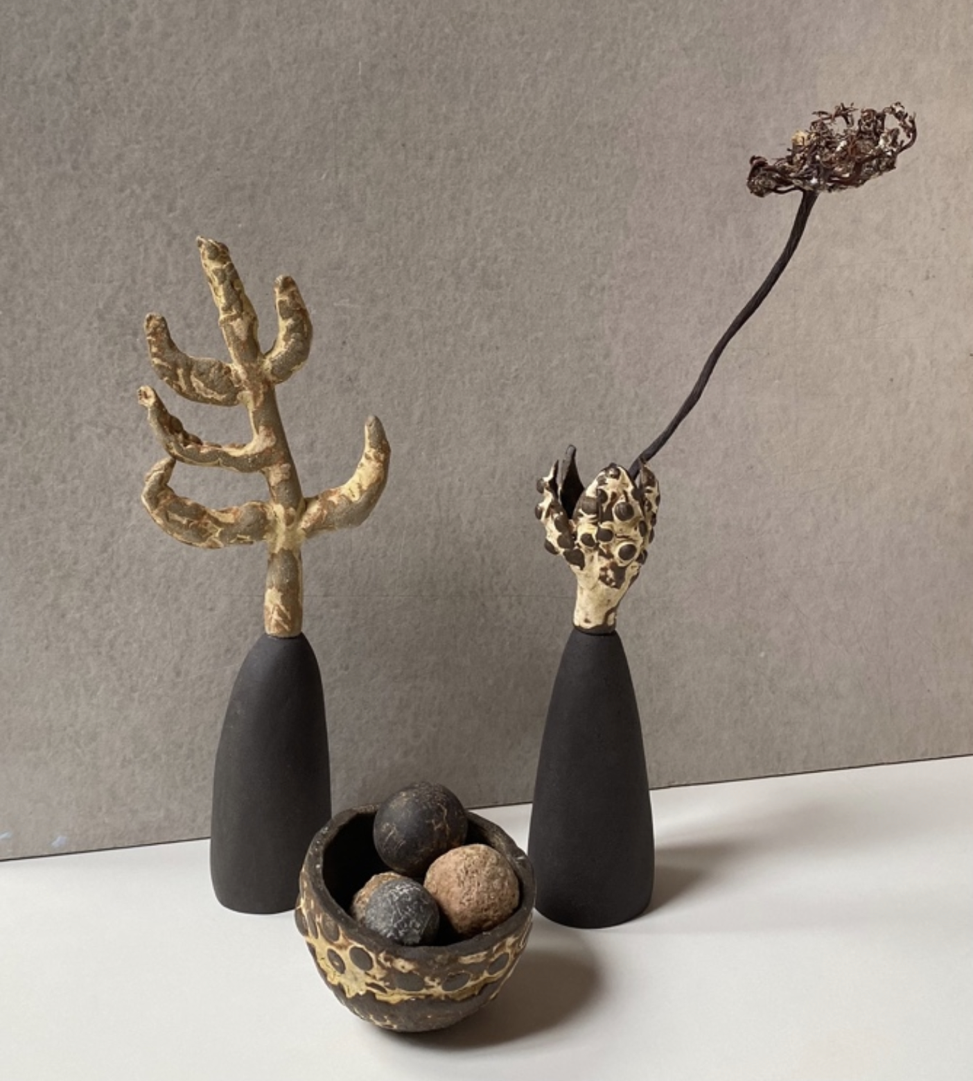 Black stoneware, terracotta crank, grey stoneware and anthracite stoneware with textured glaze . Preserved sugar kelp stem.