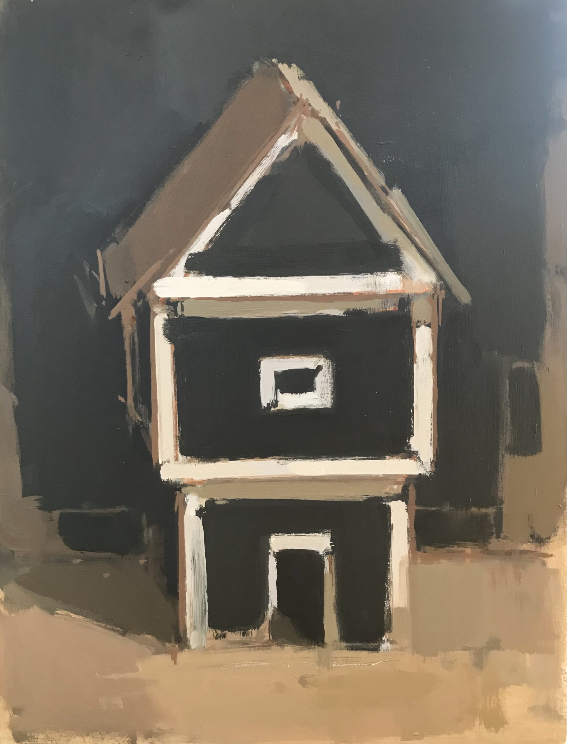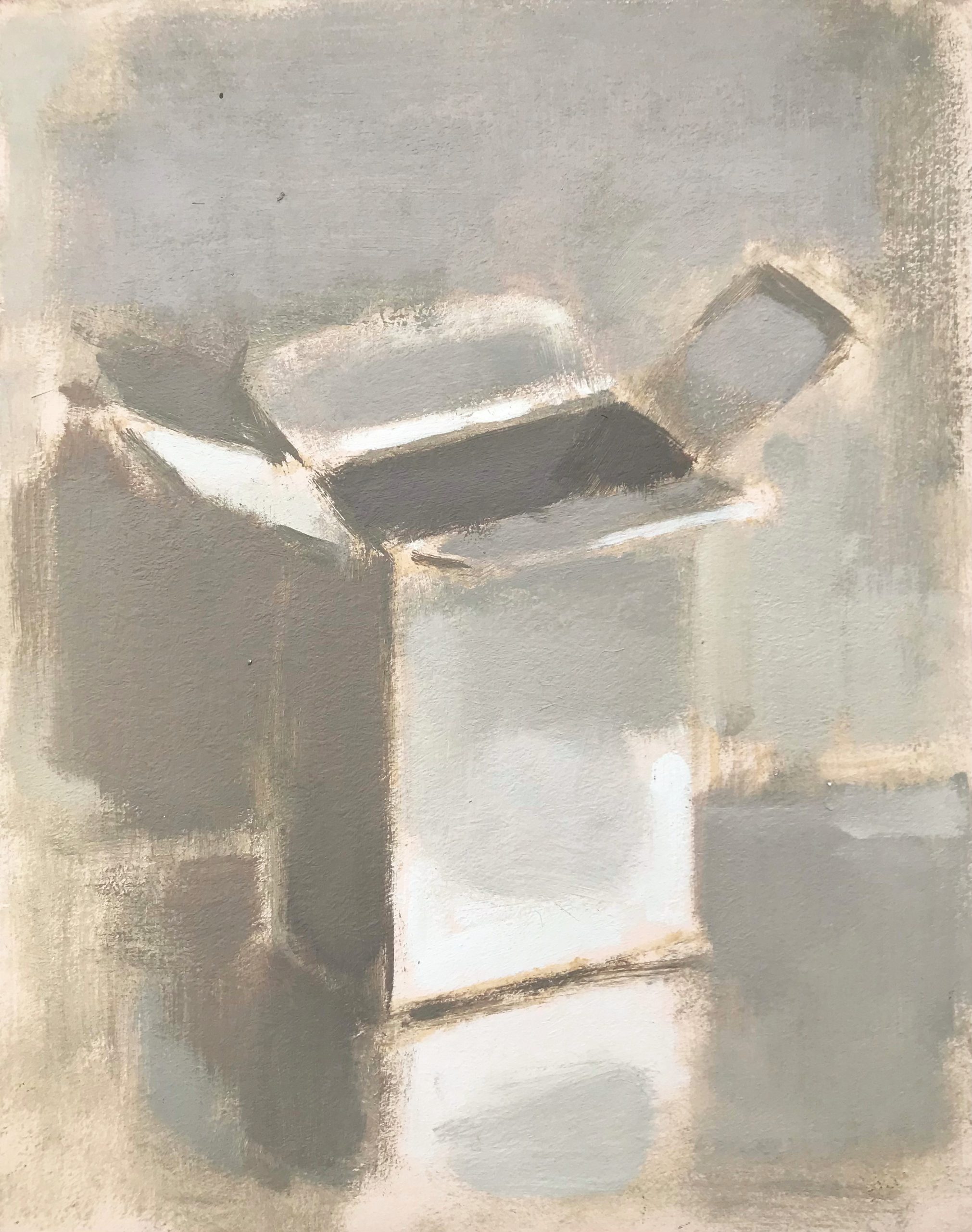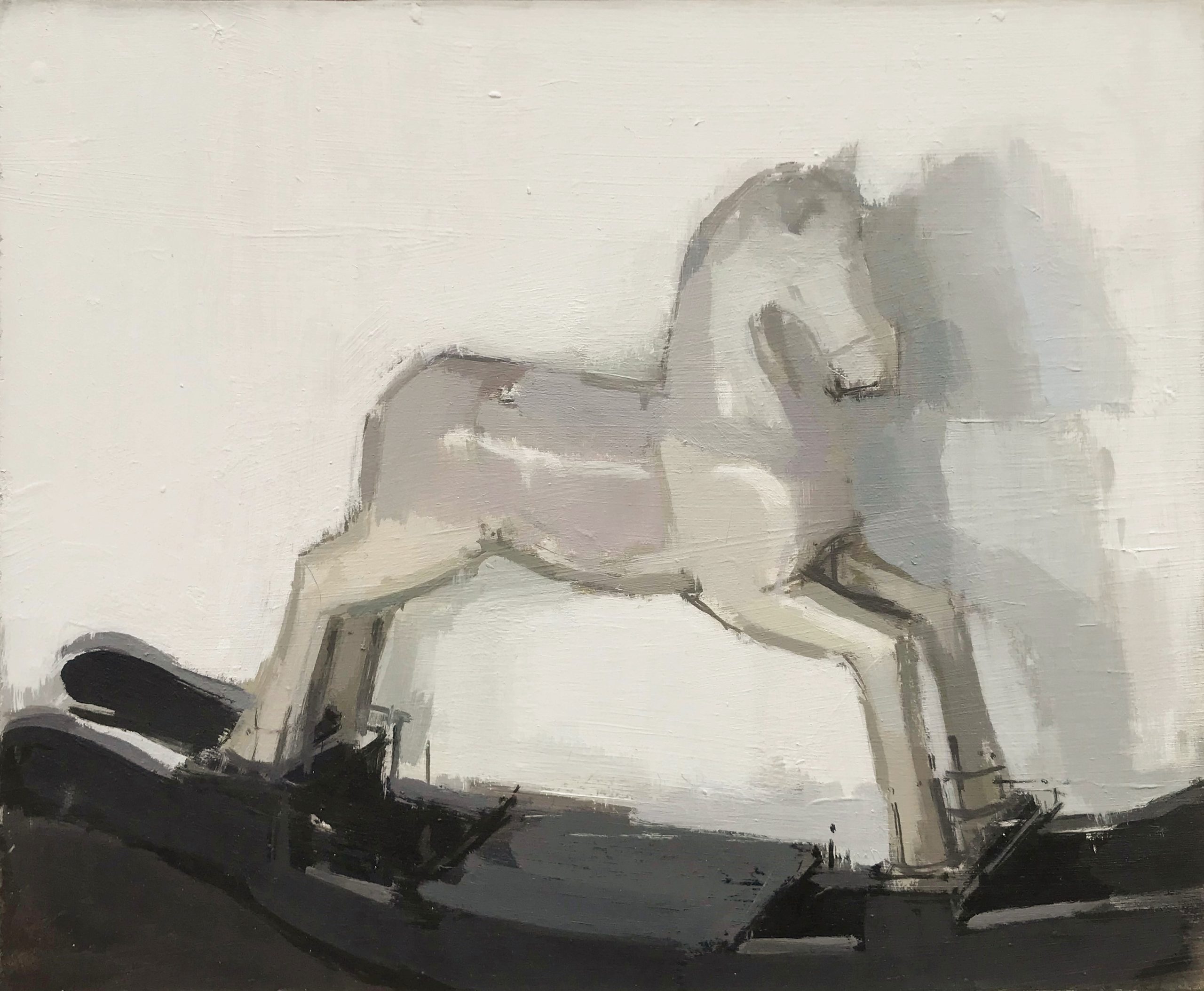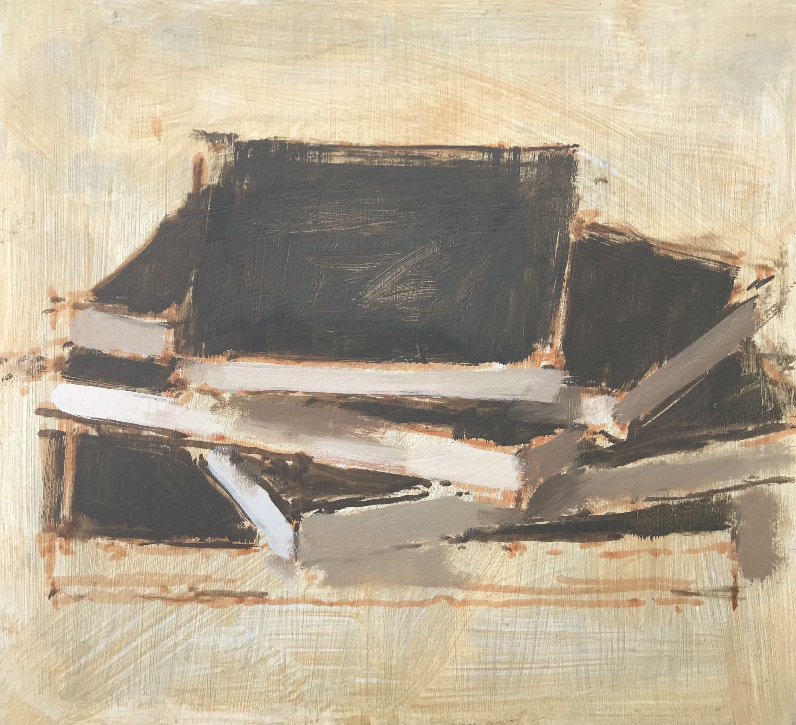 ‘My paintings depict hand-made objects, props or models that are typically set within a shallow space like a display case. A wooden boat, a toy car made from card or a paper plane – there is usually something simplistic or naïve about the form and these objects are often painted into their backgrounds. The process of making the painting then alternates between observation and intuition.’