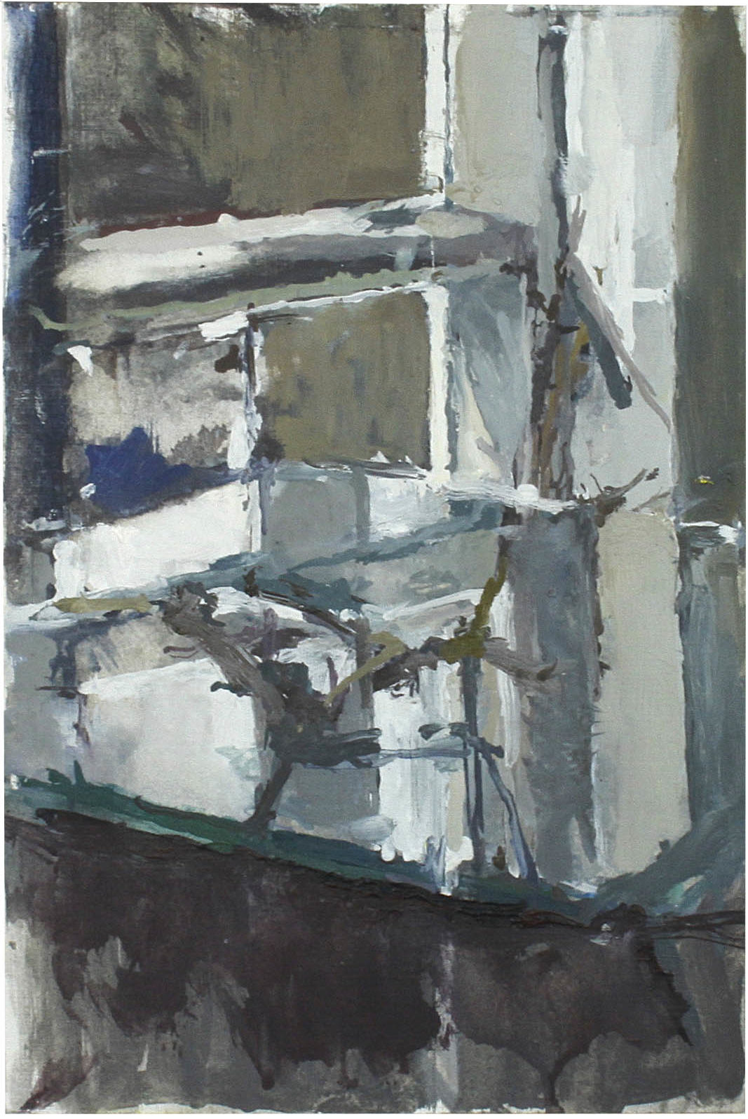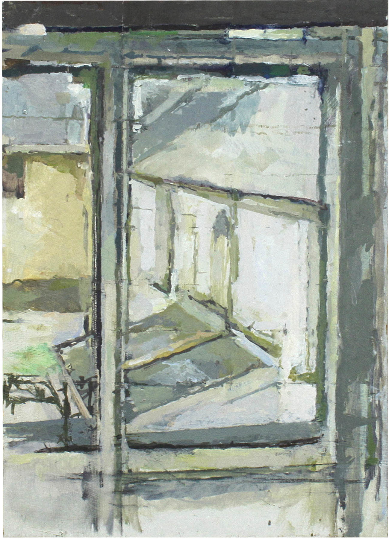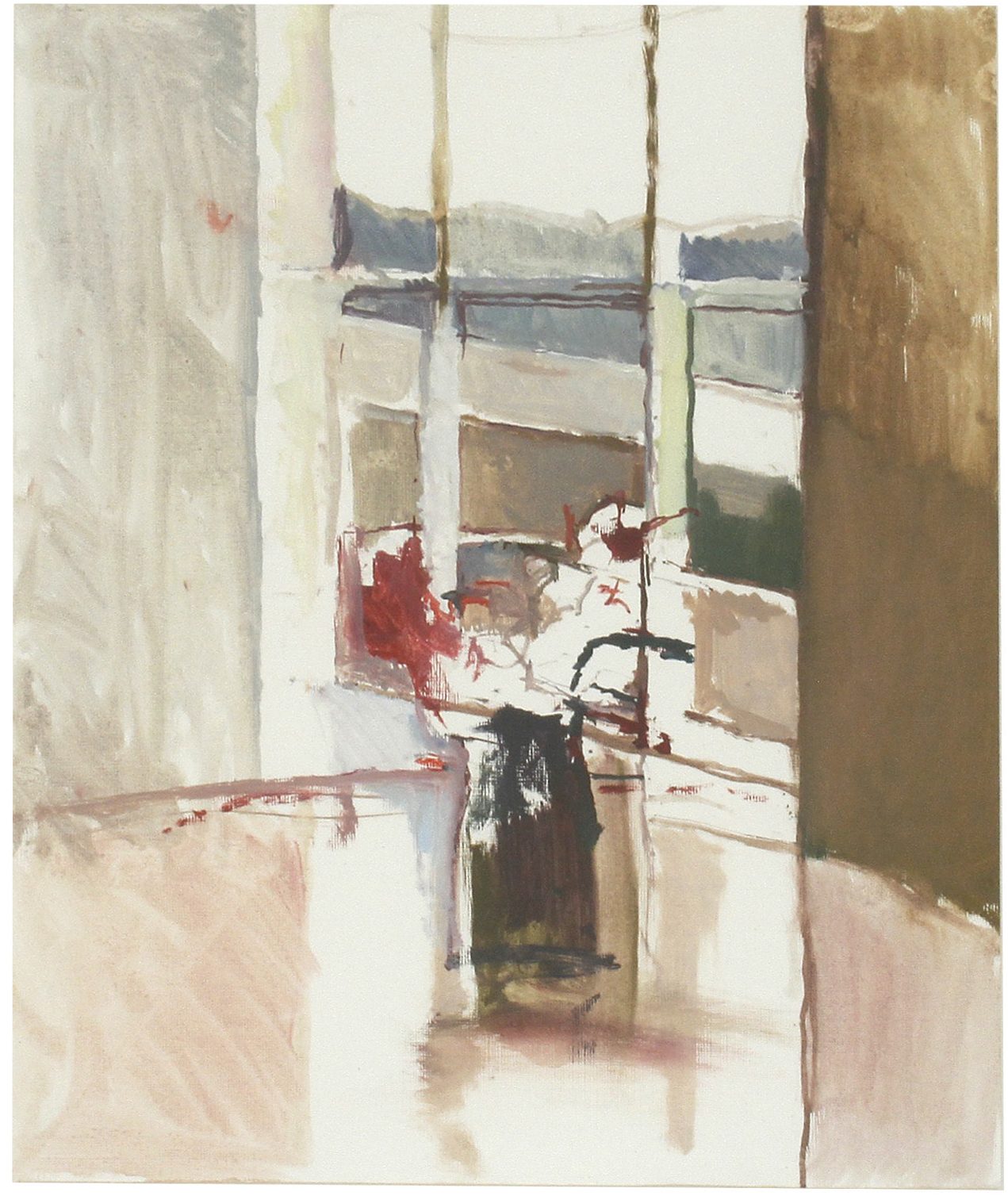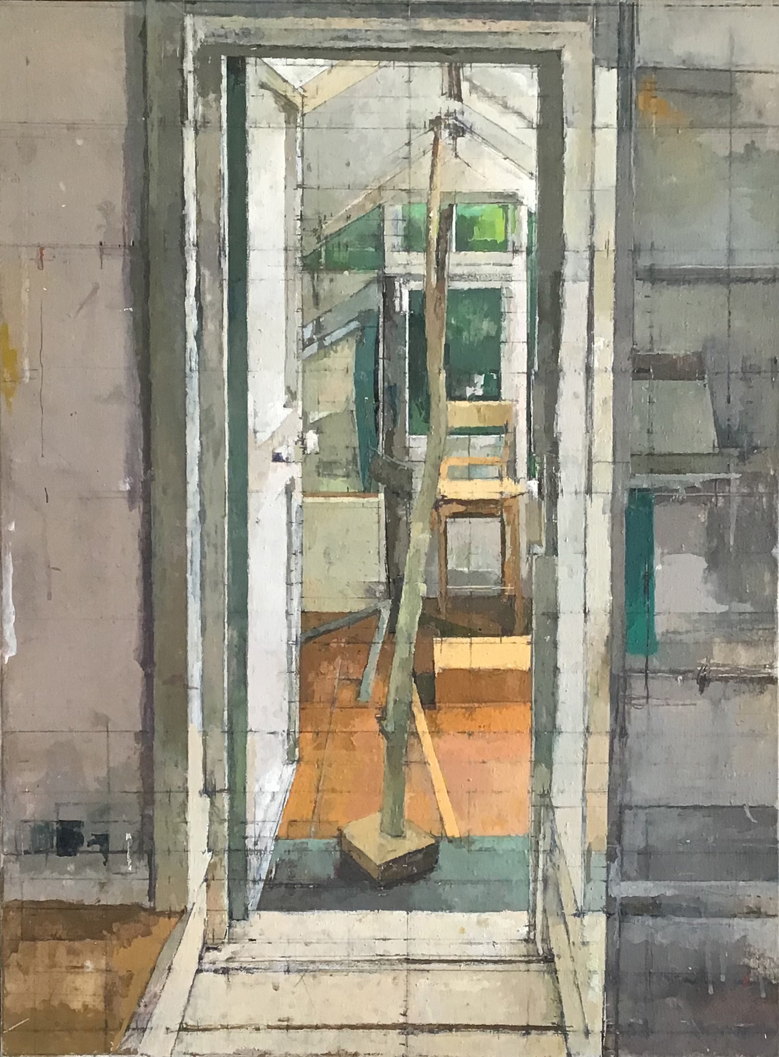 Kay writes; The model in the environment and the environment itself is the motif I continue to work from. My concern with the flat pattern across the rectangle and the spatial movement within the motif is a thread that continues to run through my work; doorways, windows, indistinct reflections, branches, layering inside and outside. These things are beautiful, not for what they are but for their web of shapes and the mystery they take on in the dense grey light or intense sunshine of a Cornish day.