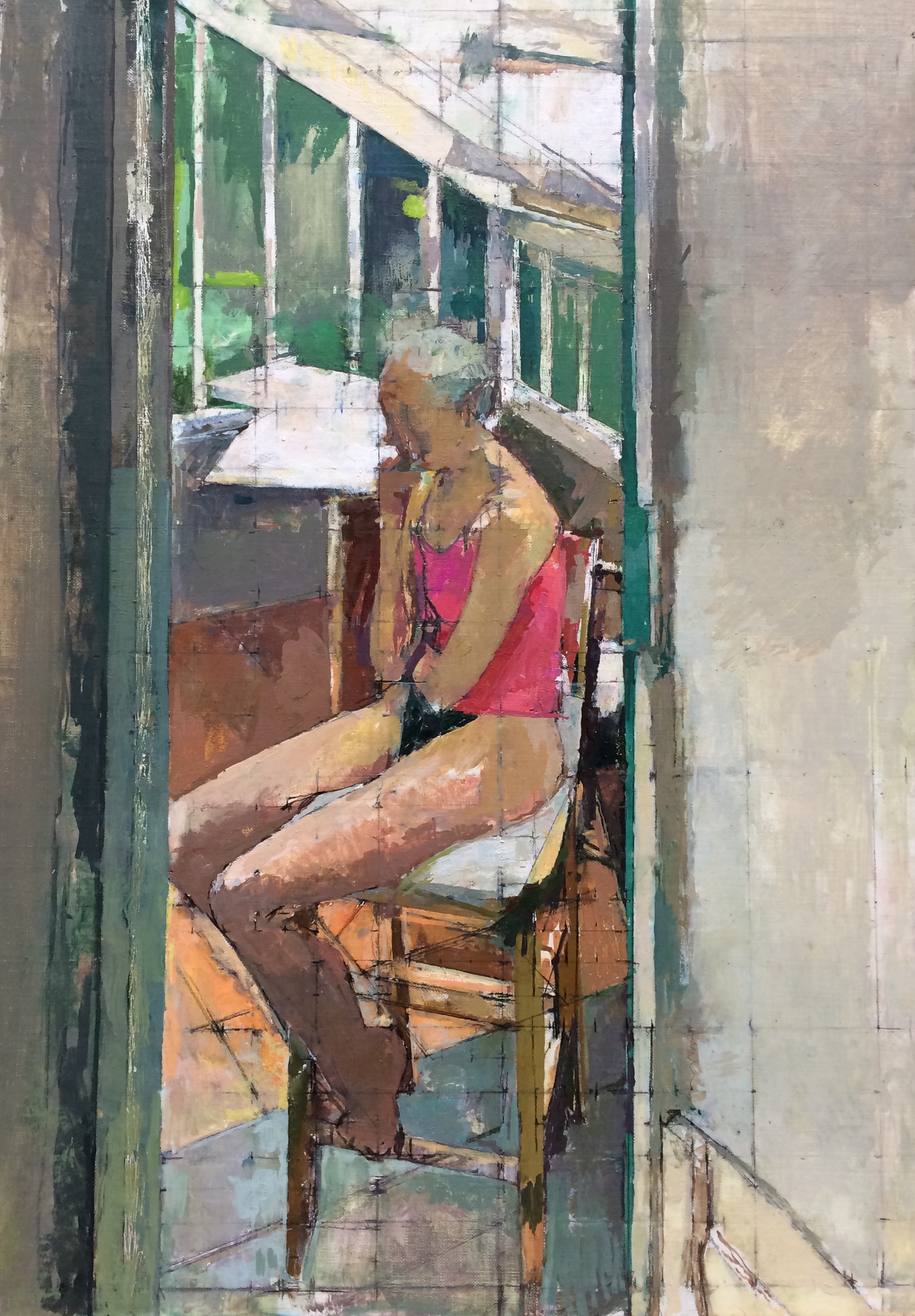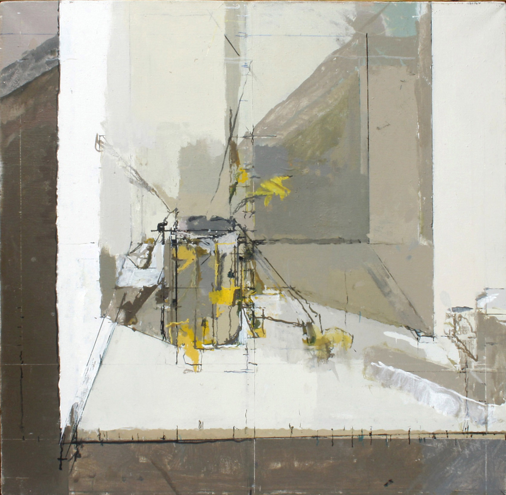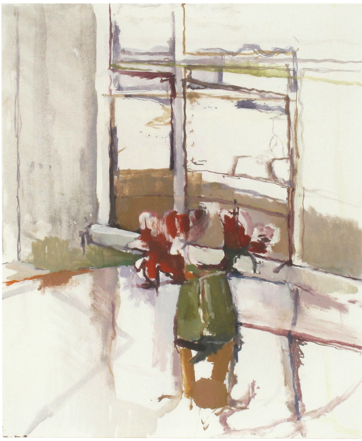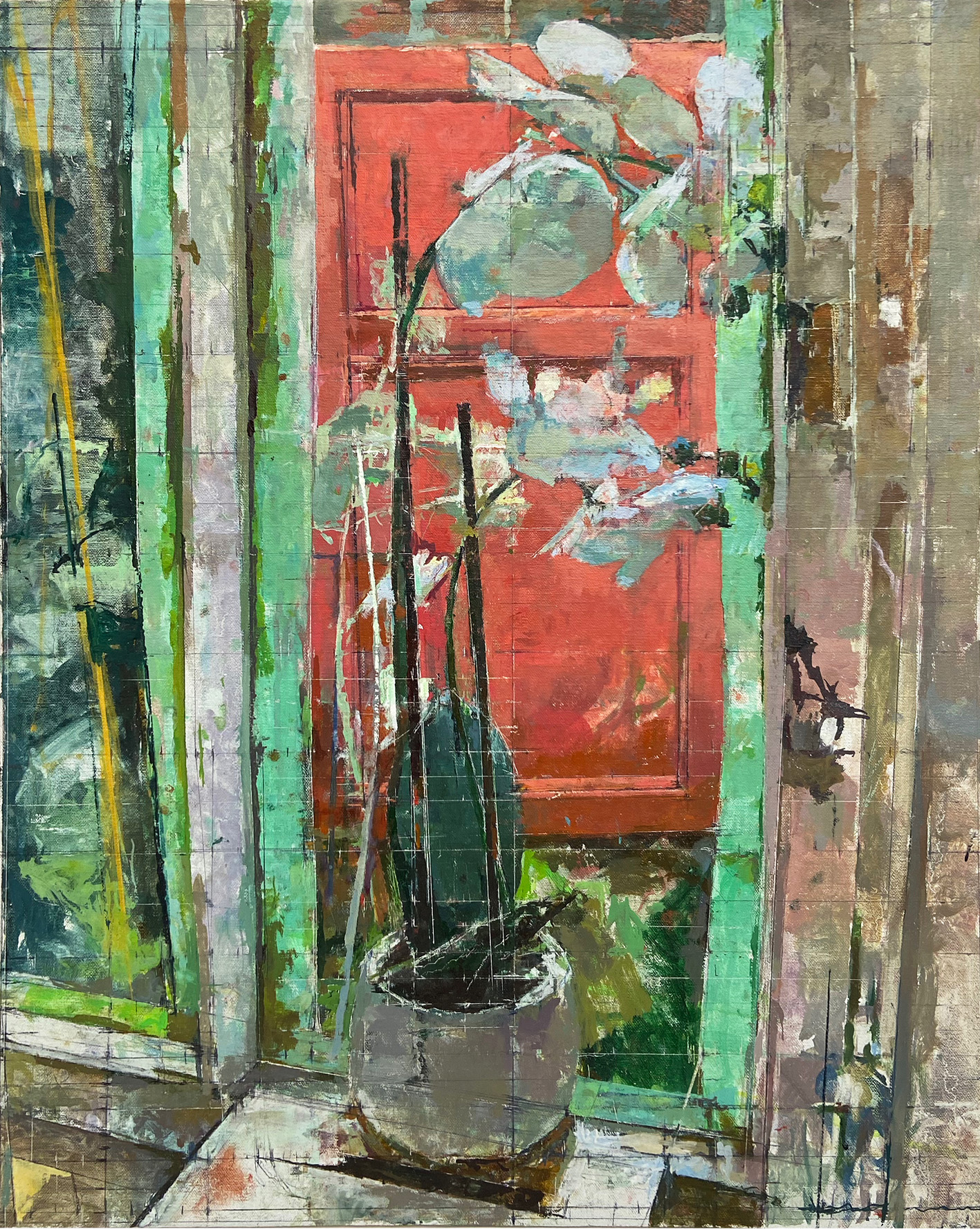 Kay writes; The model in the environment and the environment itself is the motif I continue to work from. My concern with the flat pattern across the rectangle and the spatial movement within the motif is a thread that continues to run through my work; doorways, windows, indistinct reflections, branches, layering inside and outside. These things are beautiful, not for what they are but for their web of shapes and the mystery they take on in the dense grey light or intense sunshine of a Cornish day.
