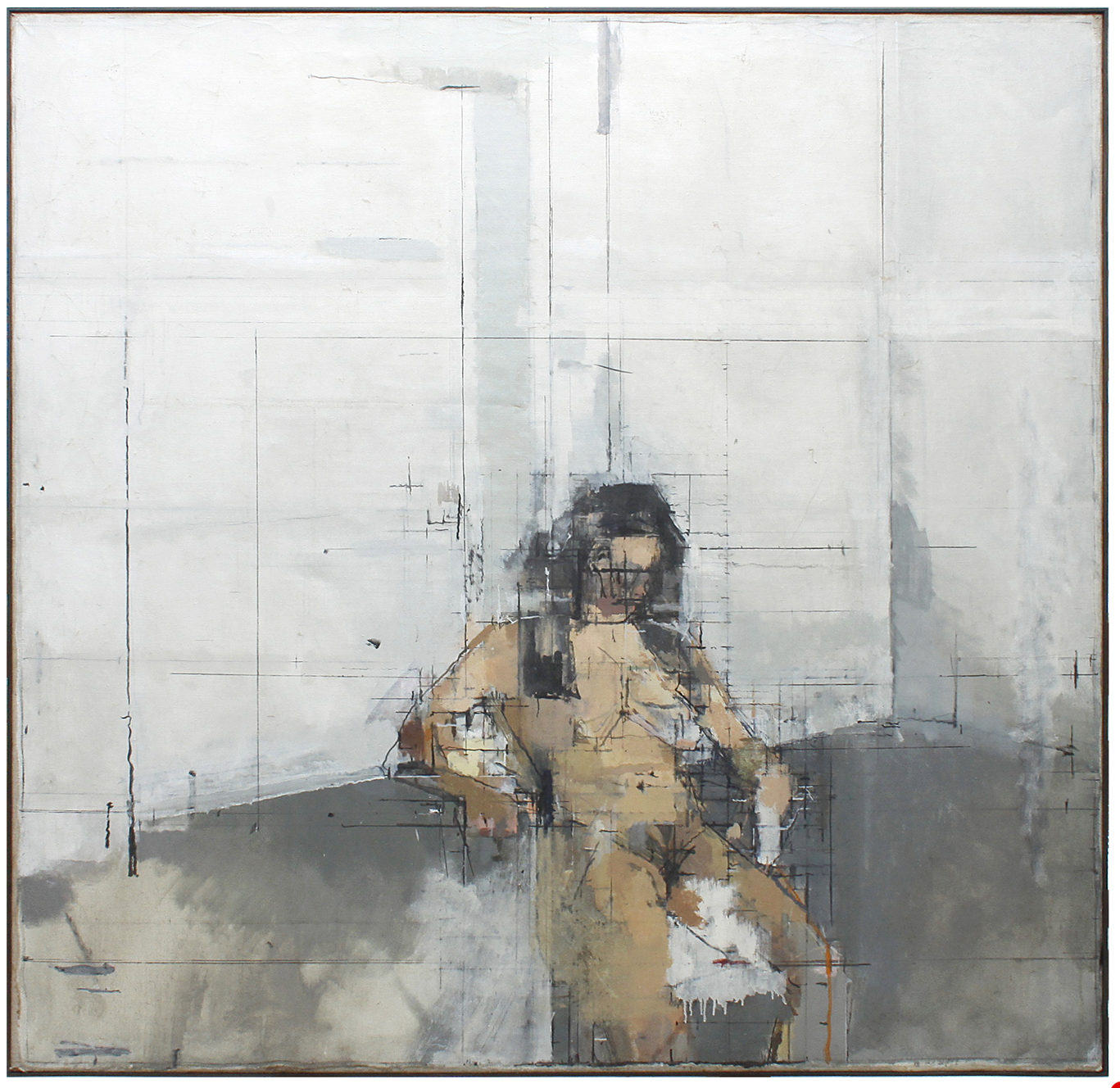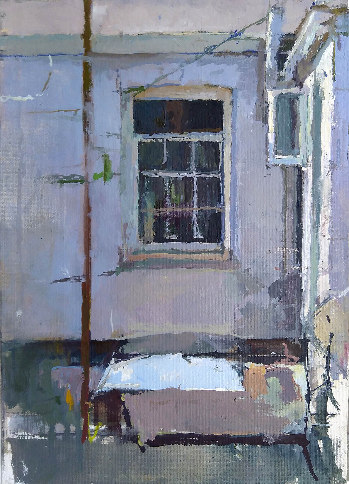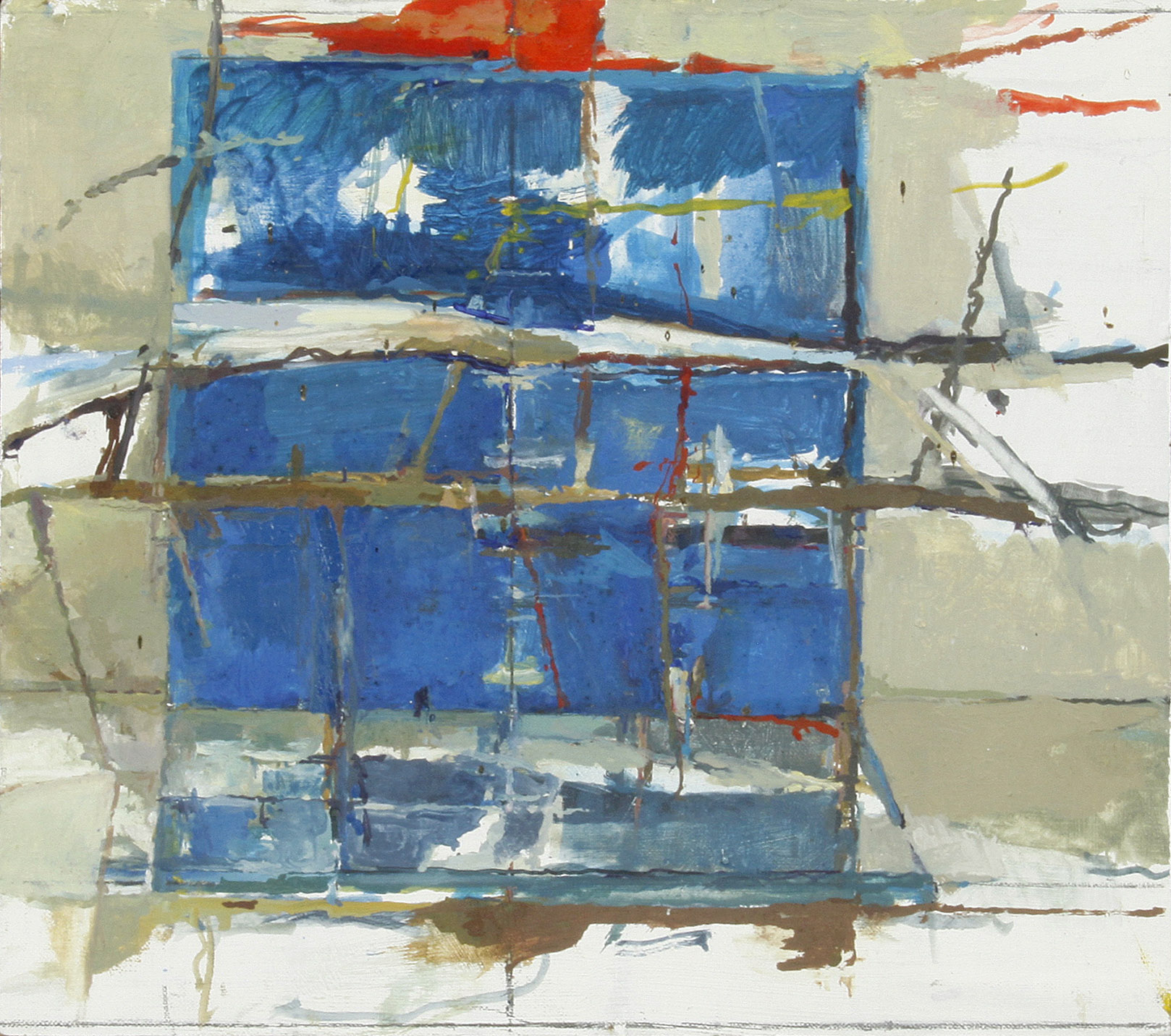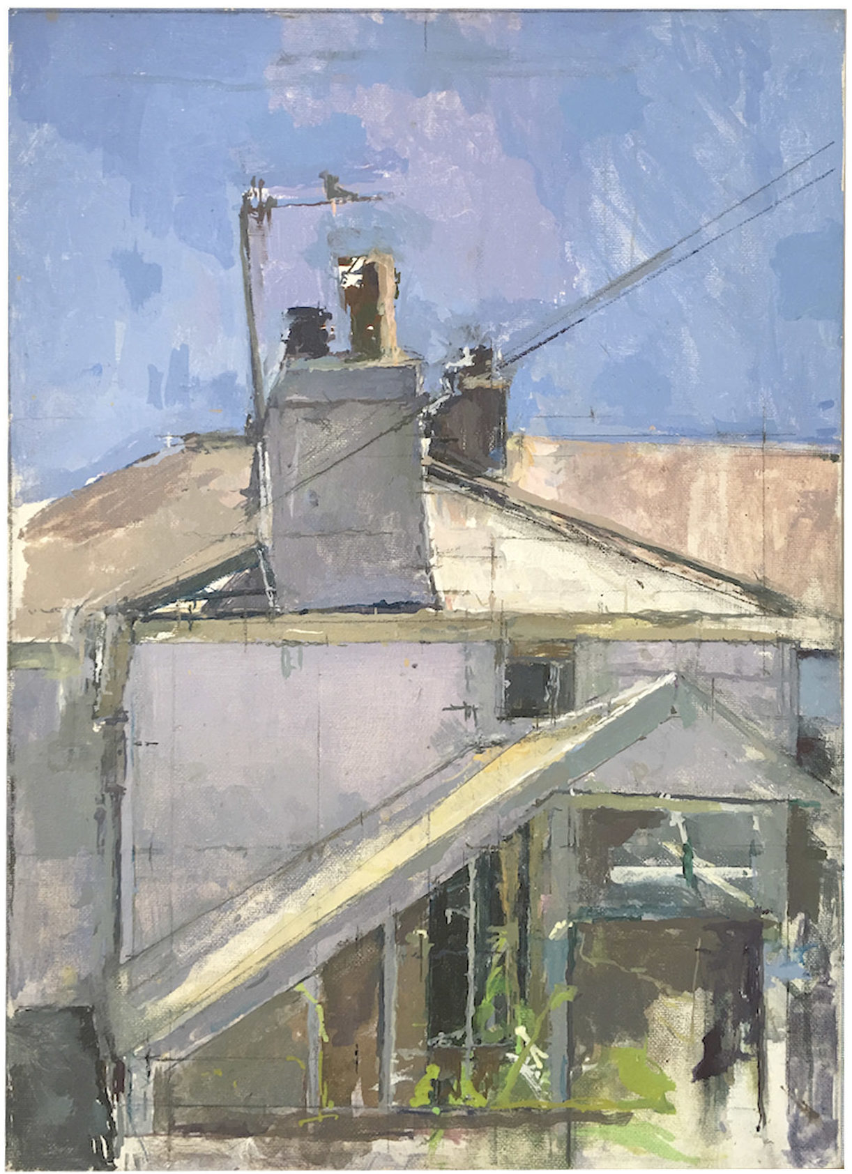 Kay writes; The model in the environment and the environment itself is the motif I continue to work from. My concern with the flat pattern across the rectangle and the spatial movement within the motif is a thread that continues to run through my work; doorways, windows, indistinct reflections, branches, layering inside and outside. These things are beautiful, not for what they are but for their web of shapes and the mystery they take on in the dense grey light or intense sunshine of a Cornish day.