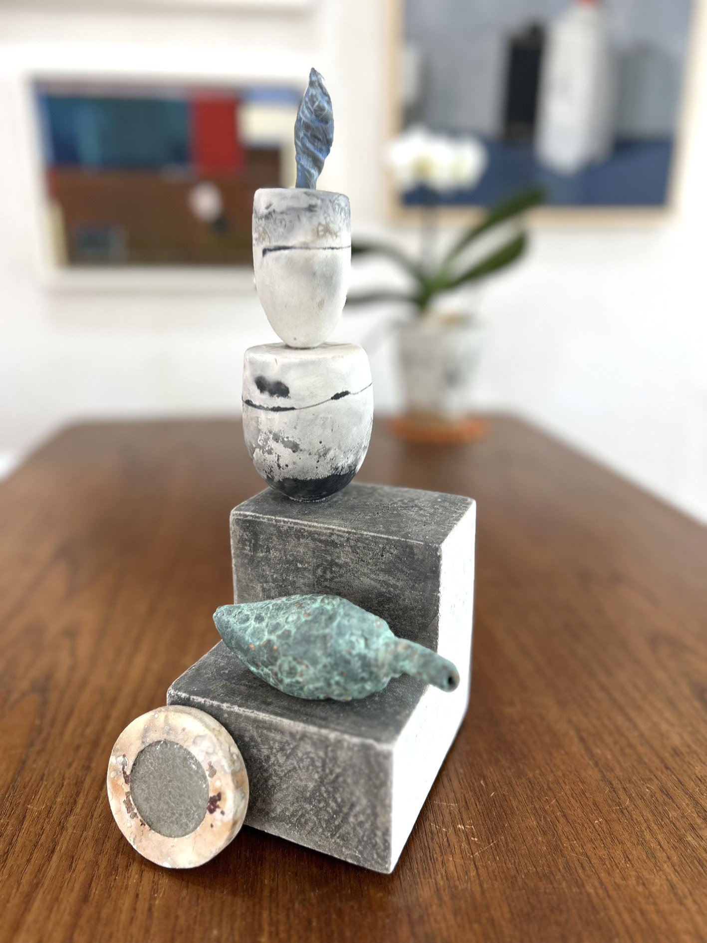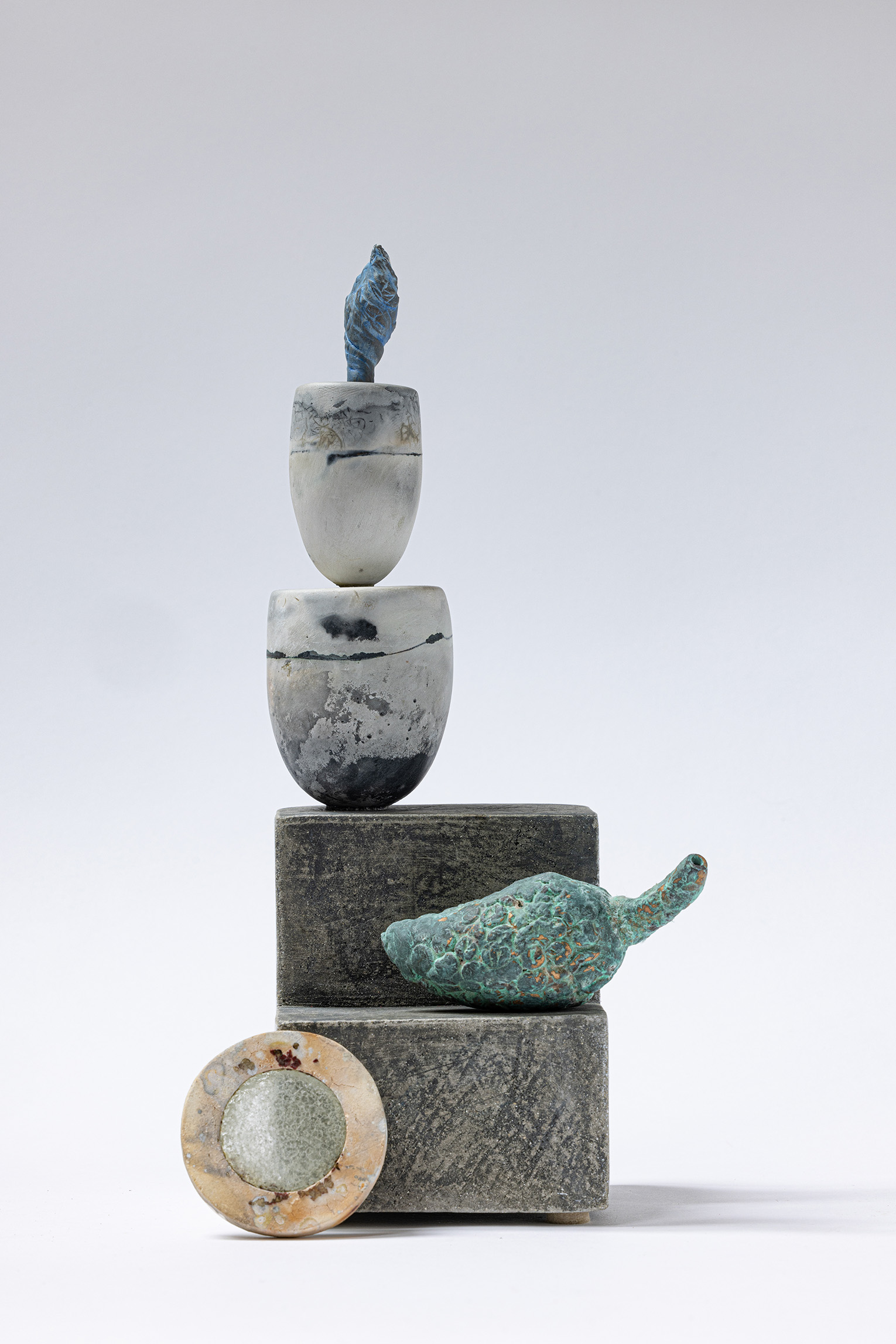 Saggar Fired Porcelain, Cast Glass, Grey Stoneware, With Vertigris Copper Leaf
