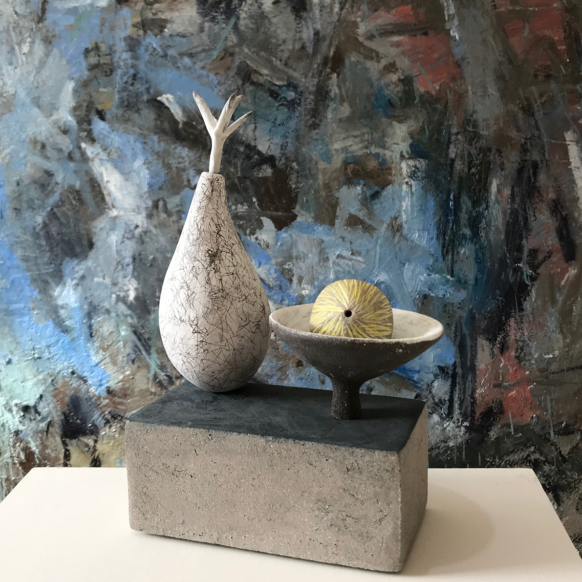 Grey stoneware, black earthenware, black stoneware and underglaze colour