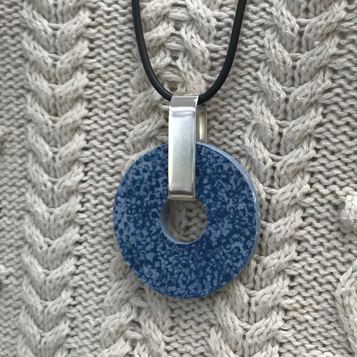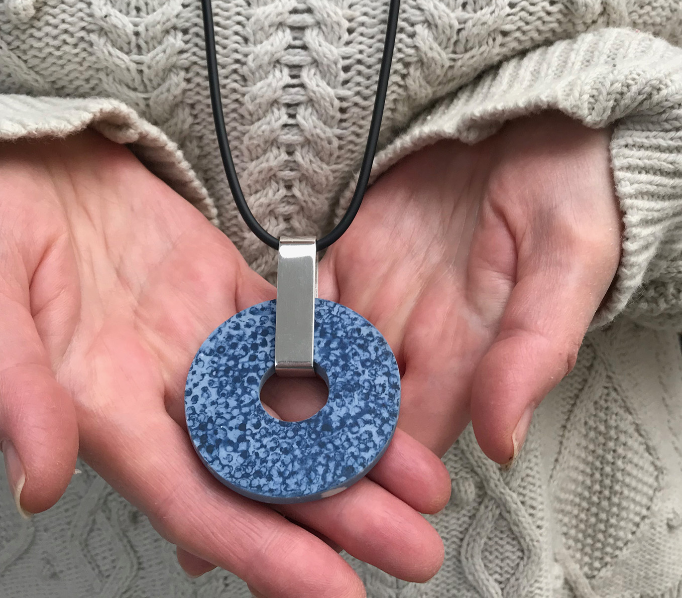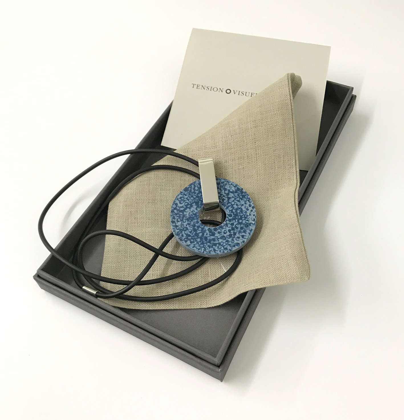 Printed and coloured porcelain, sterling silver and rubber cord.