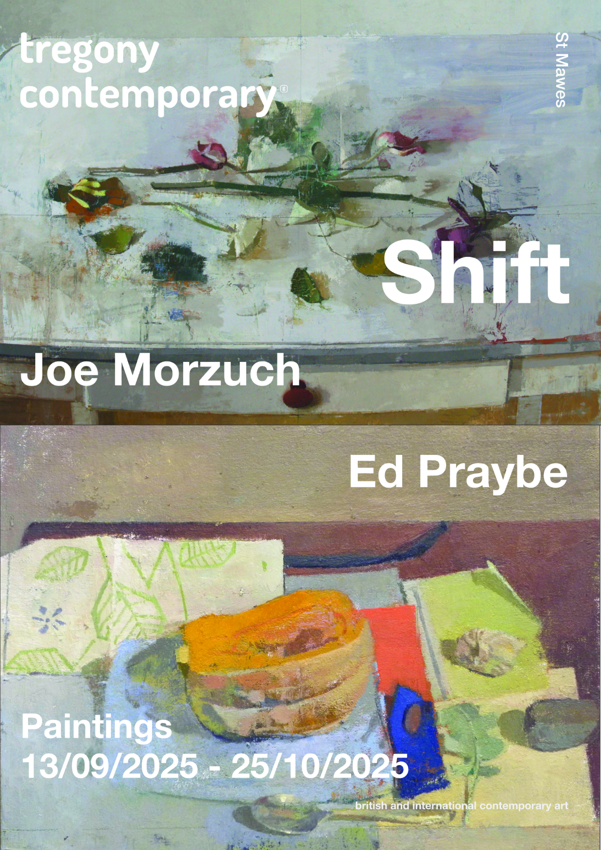 Tregony Contemporary is proud to present SHIFT, a two-person exhibition by American painters Joe Morzuch and Edmond Praybe. Though each artist brings a distinct voice and sensibility to their practice, both are rooted in a deep engagement with the observed world — responding to the quiet drama of everyday objects, domestic interiors, and shifting spatial relationships through painting.